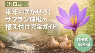 収穫が終わったサフランの球根、捨てていませんか?日本一の産地の農法「竹田式」なら、来年もっと多くの花を咲かせられます!球根を太らせるための植え付け手順、最適な土と肥料の選び方を、収益化コンサルが徹底解説。