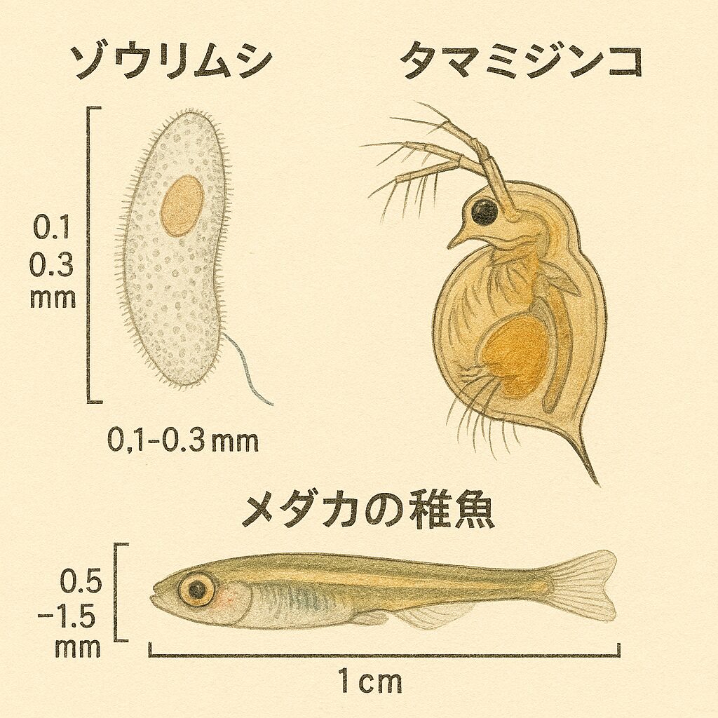 - 針子〜1cm弱まではゾウリムシ一択。0.1〜0.3mmの極小サイズで捕食成功率が高い